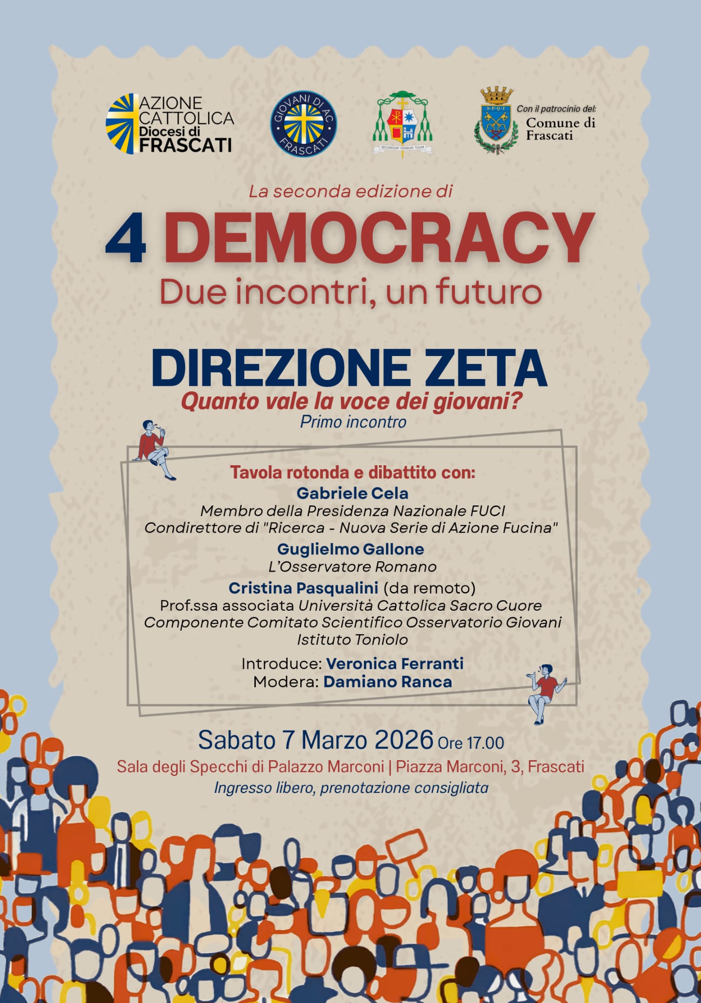 Il 7 marzo e il 9 maggio 2026 a Frascati e a Grottaferrata l’Azione Cattolica organizza la seconda edizione di 4Democracy. L’appuntamento, dedicato l’anno scorso allo stato di salute della democrazia, è in questa edizione puntato sul domani del nostro Paese, con due particolari focus su giovani e ambiente.